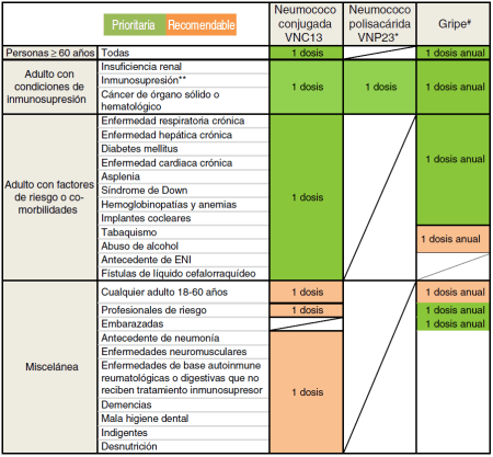 *Aunque la VNP23 no proporciona protección demostrada frente a la NAC, en los casos en que se considere igualmente su administración como parte de una pauta secuencial, buscando una protección global frente a cualquier forma de enfermedad neumocócica y no solo frente a la neumonía, VNC13 se administrará en primer lugar. VNP23 se podrá administrar al menos 8 semanas después. Para pacientes previamente vacunados con VNP23, esperar 1 año para administrar VNC13.