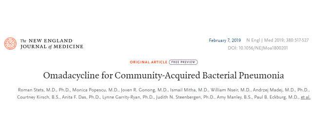 Un reciente estudio publicado en el The New England Journal of Medicine analiza el uso de la Omadaciclina, un nuevo antibiotico de la familia de las aminometilciclinas que se administra una vez al día por vía oral o intravenosa y que alcanza altas concentraciones en tejido pulmonar siendo activo frente a los patógenos más comunes implicados en la Neumonía adquirida en la comunidad (NAC).