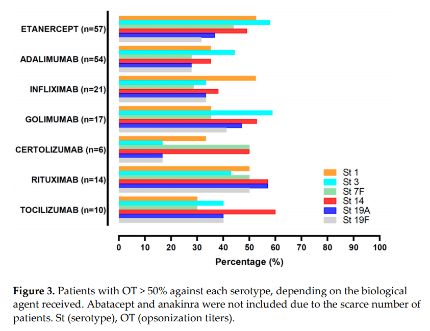 De los 182 pacientes con AIID que completaron el protocolo de vacunación, aquellos que estaban tratados con etanercept tendían a alcanzar títulos de OPKA frente a un número mayor de serotipos que el resto de pacientes en otras terapias biológicas. Por otro adalimumab se asoció a un número menor de títulos de anticuerpos. Rituximab no se asoció con una peor respuesta en comparación con el resto de agentes biológicos.