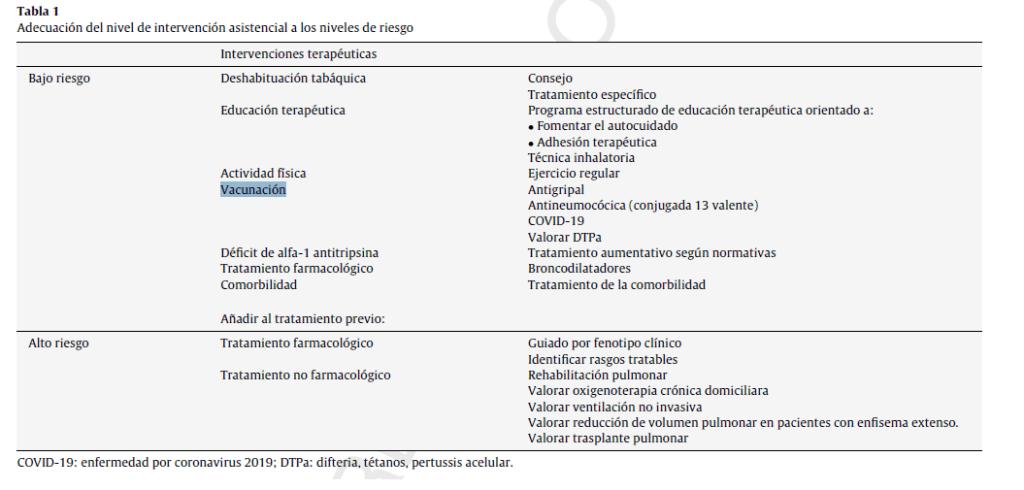 Los pacientes con EPOC deben cumplir con las vacunaciones recomendadas (ver tabla) y con las medidas de protección de uso de mascarilla, higiene de manos y distancia social.